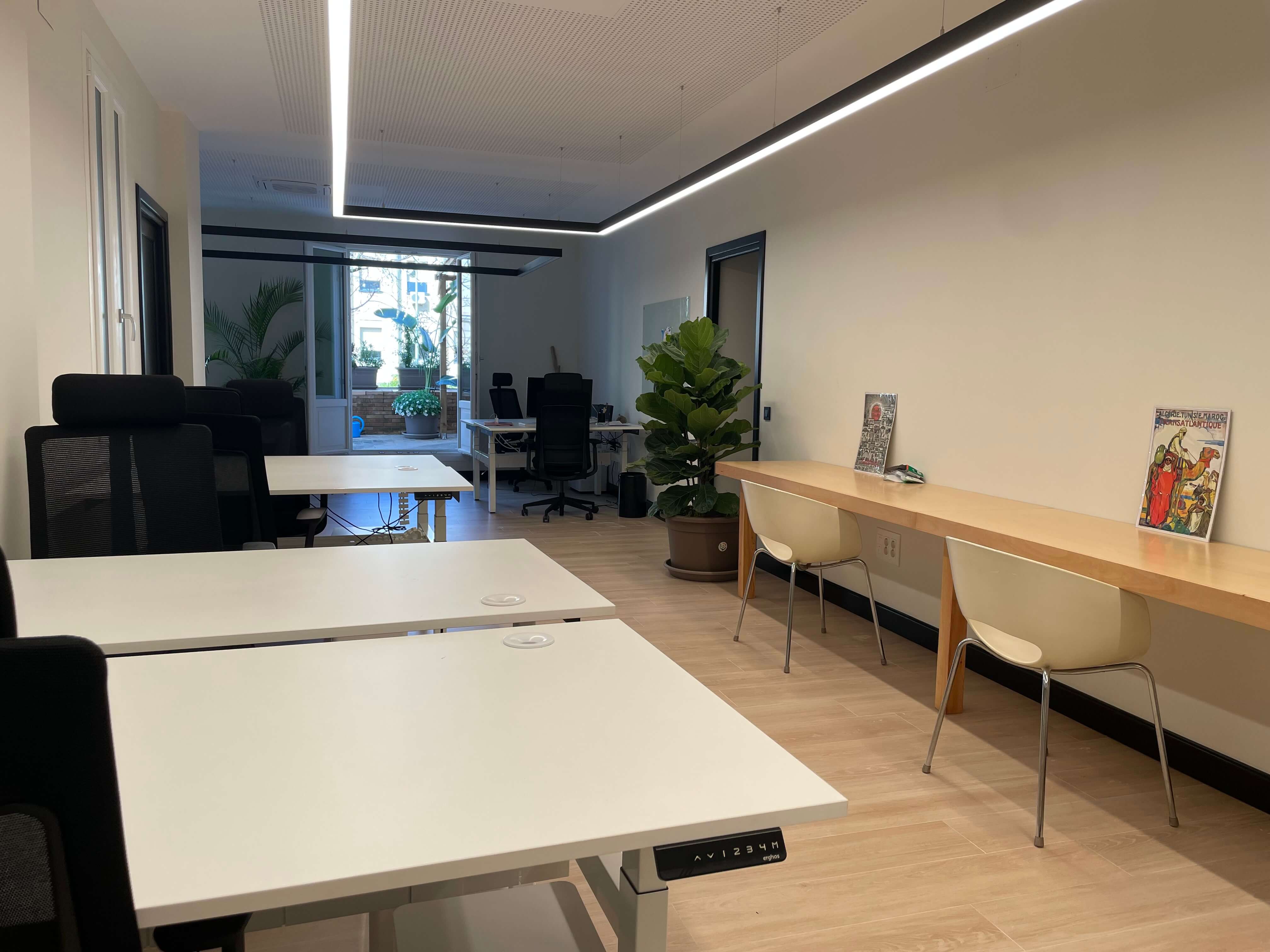 Nuestros escritorios amplios y regulables en altura permiten trabajar de pie o sentado y con enchufes integrados. Las sillas ergonómicas garantizan comodidad para jornadas largas, creando un espacio funcional e inspirador.
